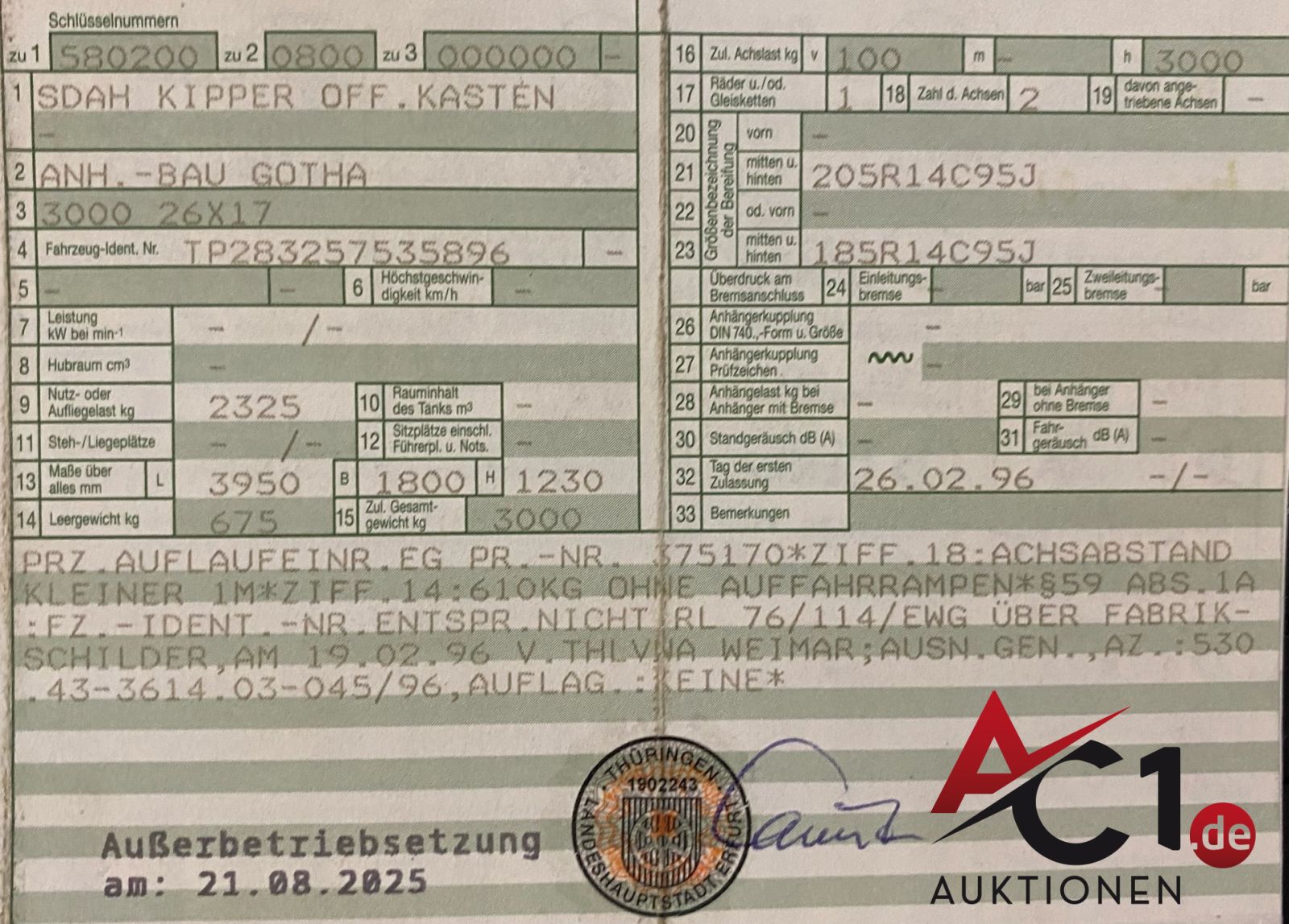 Das Auktionshaus Chemnitz weist ausdrücklich darauf hin, dass sämtliche zum Verkauf stehende Artikel ungeprüft sind. Bei allen zum Verkauf stehenden Fahrzeugen und Maschinen ist davon auszugehen, dass diese bereits einen nicht unerheblichen Vorschaden erlitten haben.