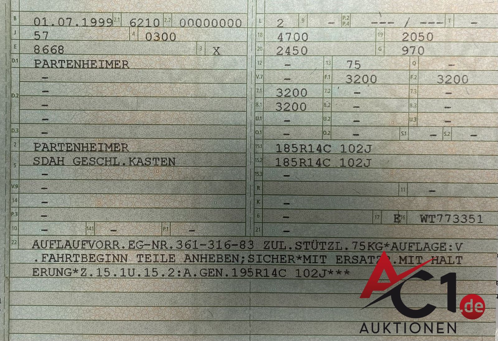 Das Auktionshaus Chemnitz weist ausdrücklich darauf hin, dass sämtliche zum Verkauf stehende Artikel ungeprüft sind. Bei allen zum Verkauf stehenden Fahrzeugen und Maschinen ist davon auszugehen, dass diese bereits einen nicht unerheblichen Vorschaden erlitten haben.