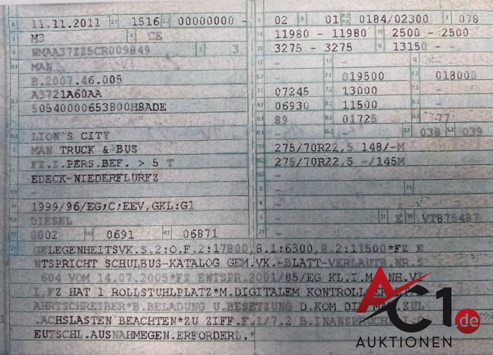 Das Auktionshaus Chemnitz weist ausdrücklich darauf hin, dass sämtliche zum Verkauf stehende Artikel ungeprüft sind. Bei allen zum Verkauf stehenden Fahrzeugen und Maschinen ist davon auszugehen, dass diese bereits einen nicht unerheblichen Vorschaden erlitten haben.