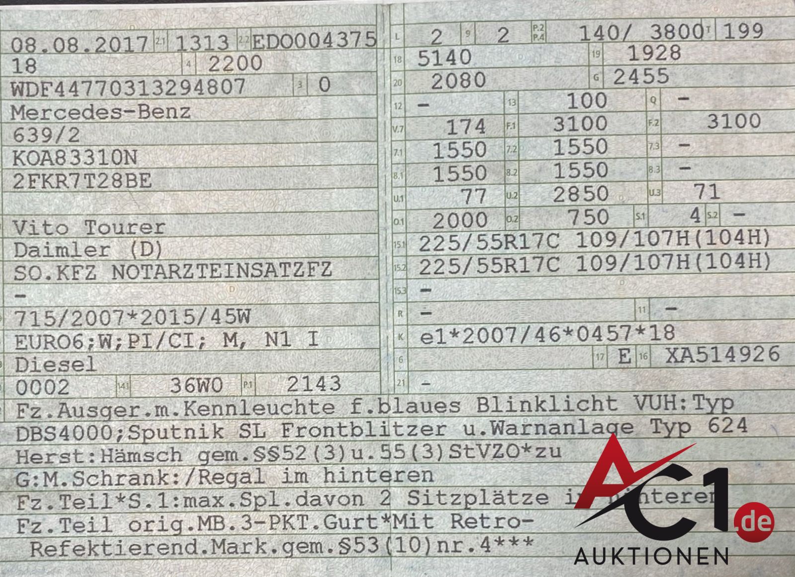 Lot: 4993 - MB Vito Tourer 119 d 4matic So.KFZ Notarzteinsatzwagen WAS 4 Sitze