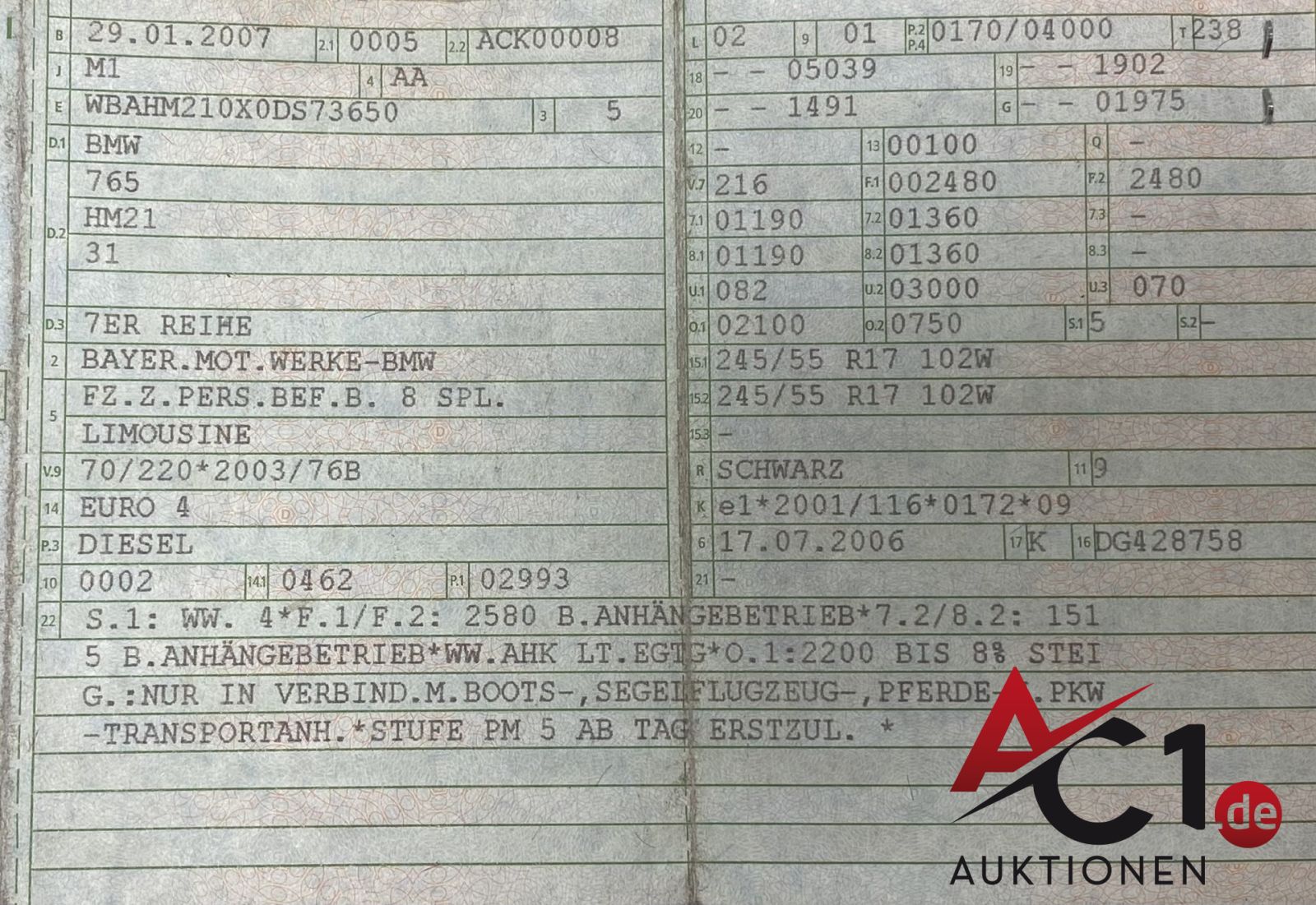 Alle Angaben im Auktionskatalog (z. B. technische Informationen, Daten, Maße, Baujahre und Kilometerstände) sind unverbindliche Angaben vom Einlieferer und werden vom Auktionshaus nicht überprüft.