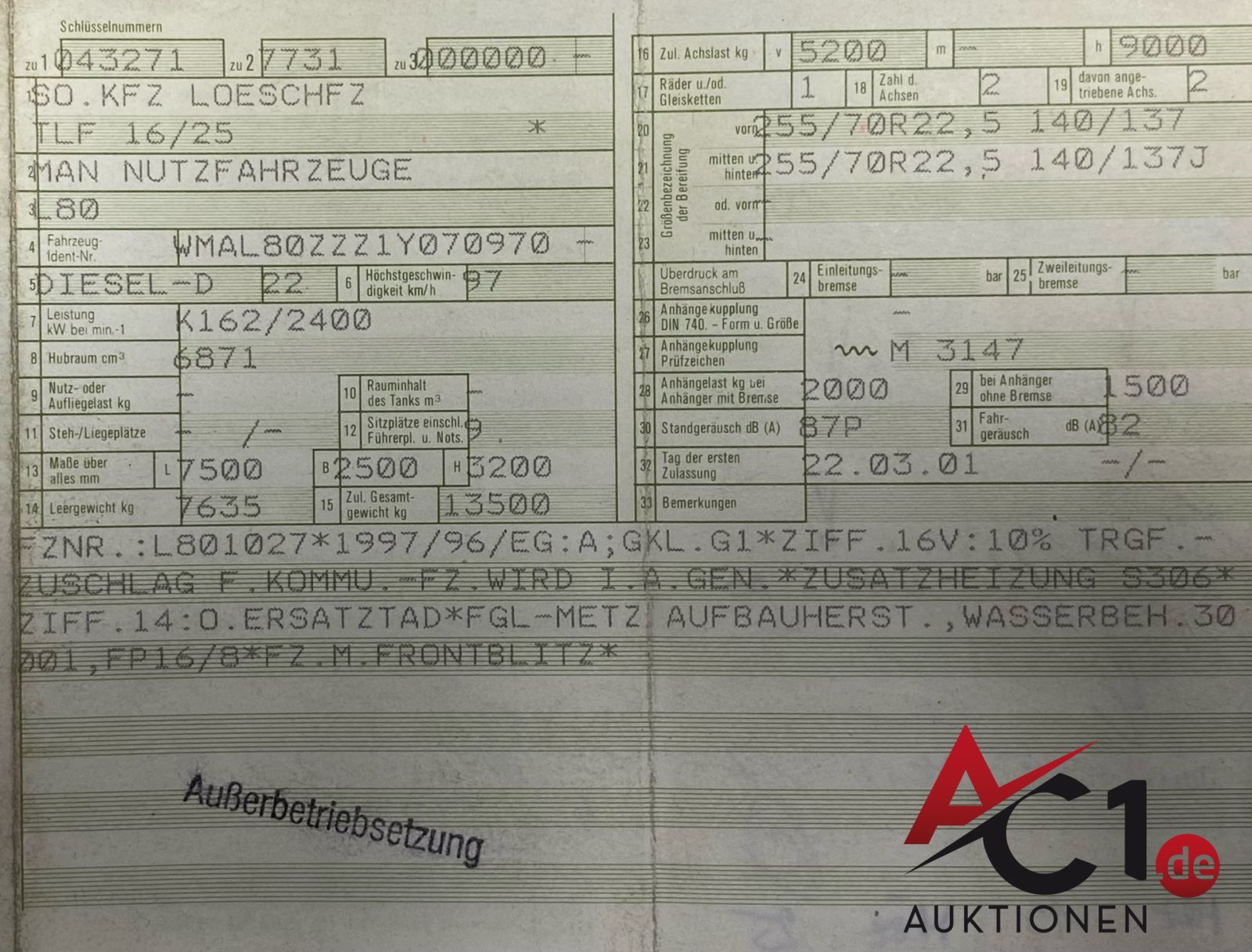 Das Auktionshaus Chemnitz weist ausdrücklich darauf hin, dass sämtliche zum Verkauf stehende Artikel ungeprüft sind. Bei allen zum Verkauf stehenden Fahrzeugen und Maschinen ist davon auszugehen, dass diese bereits einen nicht unerheblichen Vorschaden erlitten haben.