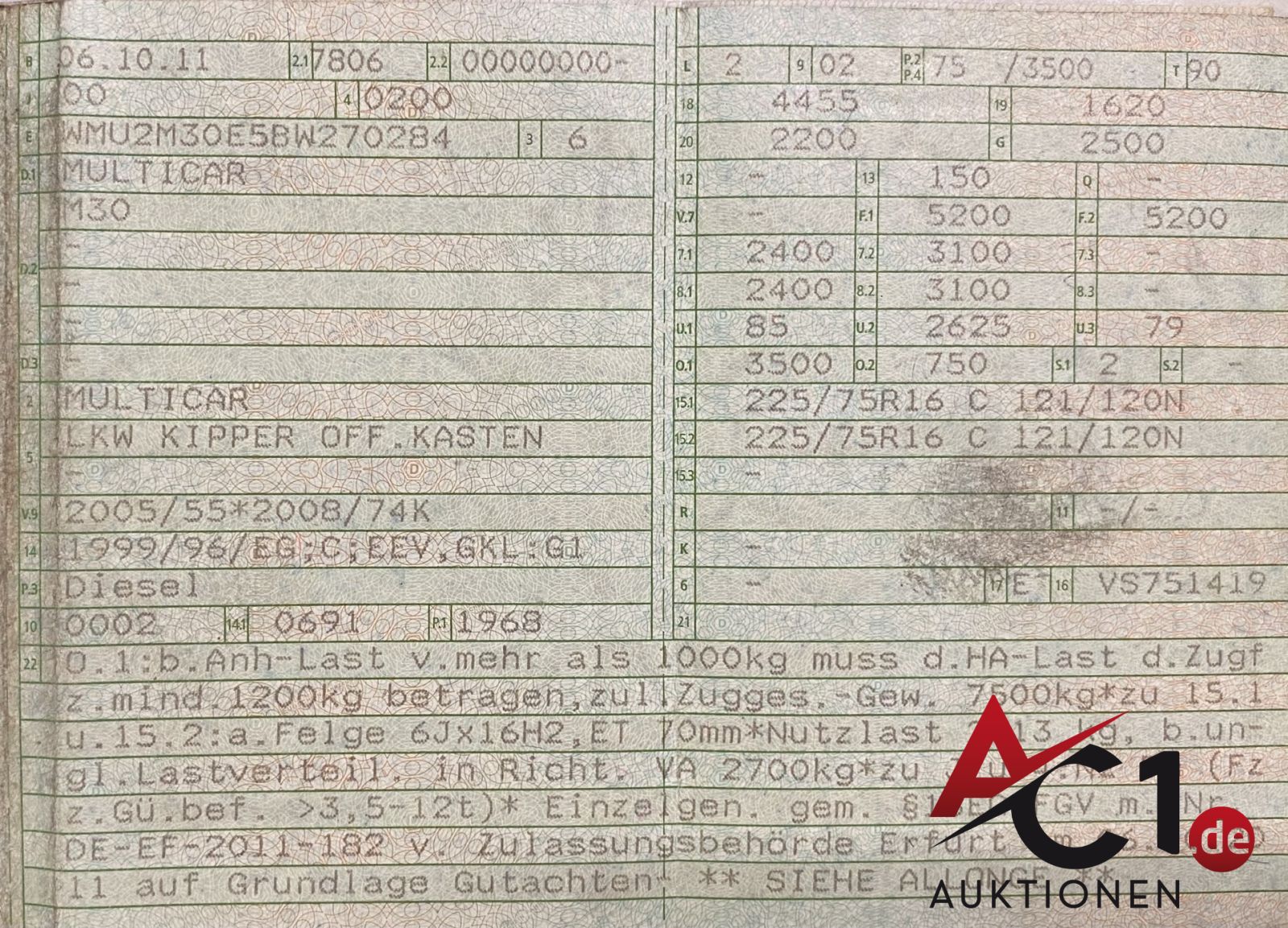 Das Auktionshaus Chemnitz weist ausdrücklich darauf hin, dass sämtliche zum Verkauf stehende Artikel ungeprüft sind. Bei allen zum Verkauf stehenden Fahrzeugen und Maschinen ist davon auszugehen, dass diese bereits einen nicht unerheblichen Vorschaden erlitten haben.